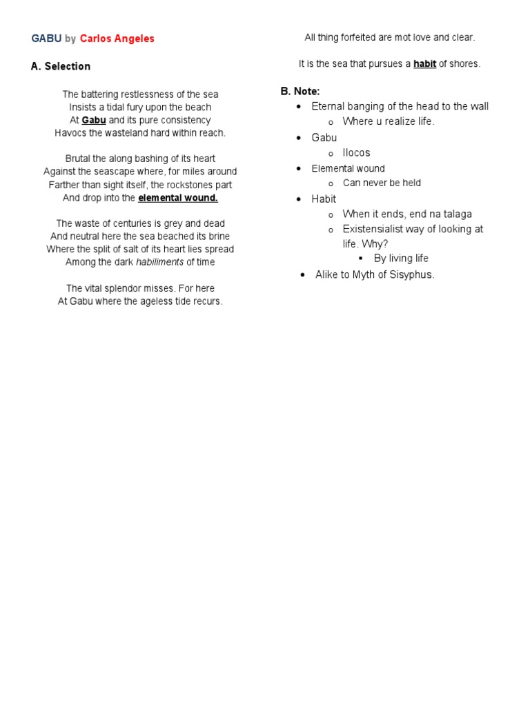 POEM ANALYSIS gabu.docx - POEM ANALYSIS GABU by Carlos ... from www.coursehero.com Gabu through permutations of time and memory carlos angeles' poem gabu (angeles 119) is a portrait of a seashore that permutes through the perceptions of time and the dimensions of memory. Gabu by carlos angeles sample. Insists a tidal fury upon the beach. Angeles was born in tacloban city, leyte on may 25, 1921. Place where carlos angeles were born. Get your custom essay on. Analysis angeles carlos poem essays gabu. Angeles sun in the knifed horizon bleeds the sky spilling a peacock stain upon the… — this is from a bruise of ashes: